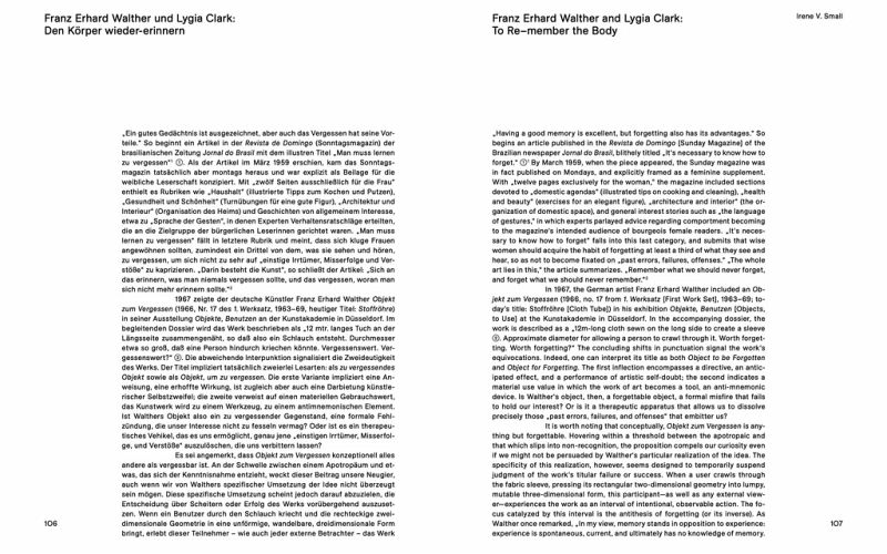The publication Action as Sculpture / Handlung als Skulptur stages an encounter between two key figures in the recent history of art whose oeuvres revolutionized the role of the beholder. Although Lygia Clark and Franz Erhard Walther never met in person and despite their works being different in many ways, the participatory approaches they developed almost simultaneously reveal fundamental similarities.
