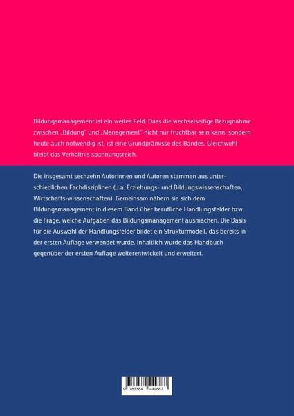 Bildungsmanagement ist ein weites Feld. Dass die wechselseitige Bezugnahme zwischen "Bildung" und "Management" nicht nur fruchtbar sein kann, sondern heute auch notwendig ist, ist eine Grundprämisse des Bandes. Gleichwohl bleibt das Verhältnis spannungsreich. Die insgesamt siebzehn Autorinnen und Autoren stammen aus unterschiedlichen Fachdisziplinen (u.a. Erziehungs- und Bildungswissenschaften, Wirtschaftswissenschaften). Gemeinsam nähern sie sich dem Bildungsmanagement in diesem Band über berufliche Handlungsfelder bzw. die Frage, welche Aufgaben das Bildungsmanagement ausmachen. Die Basis für die Auswahl der Handlungsfelder bildet ein Strukturmodell, das bereits in der ersten Auflage verwendet wurde. Inhaltlich wurde das Handbuch gegenüber der ersten Auflage weiterentwickelt und erweitert.Das Handbuch ist untergliedert in fünf Bereiche und achtzehn Kapitel: Teil 1: Strukturmodell des Bildungsmanagements (Prof. Dr. Dr. h.c. Michael Gessler), Bildungsmanagement - ein orientierender Einstieg (Prof. Dr. Ulrich Müller), Betriebliches Bildungsmanagement (Prof. Dr. Uwe Elsholz), Nachhaltiges Bildungsmanagement (Dr. Klaus Doppler).Teil 2: Strategisches Bildungsmanagement (Prof. Dr. Dr. h.c. Michael Gessler), Personalführung (Prof. Dr. Klaus Götz & Dr. Jacqueline Heider-Lang).Teil 3: Projektmanagement (Prof. Dr. Dr. h.c. Michael Gessler), Programmentwicklung und Revision (Prof. Dr. Monika Kil), Entrepreneurship (Prof. Dr. Hartmut Hinke), Change Management (Prof. Dr. Hartmut Hinke).Teil 4: Qualitätsmanagement (Michael Steig), Transfermanagement und Evaluation (Prof. Dr. Ulrich Müller & Mirjam Soland), Personalmanagement (Prof. Dr. Michael Müller-Vorbrüggen), Bildungscontrolling (Dr. Walter Schöni), Lebenslanges Lernen (Dr. Andreas Sebe-Opfermann).Teil 5: Lernen und Lehren (Prof. Dr. Karsten Wolf), Wissensmanagement (Prof. Dr. Uwe Wilkesmann & Prof. Dr. Maximiliane Wilkesmann), Bildungsmarketing (Prof. Dr. Michael Bernecker).