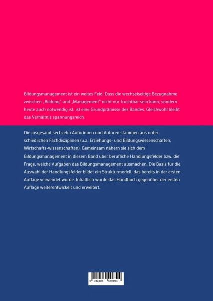 Bildungsmanagement ist ein weites Feld. Dass die wechselseitige Bezugnahme zwischen "Bildung" und "Management" nicht nur fruchtbar sein kann, sondern heute auch notwendig ist, ist eine Grundprämisse des Bandes. Gleichwohl bleibt das Verhältnis spannungsreich. Die insgesamt siebzehn Autorinnen und Autoren stammen aus unterschiedlichen Fachdisziplinen (u.a. Erziehungs- und Bildungswissenschaften, Wirtschaftswissenschaften). Gemeinsam nähern sie sich dem Bildungsmanagement in diesem Band über berufliche Handlungsfelder bzw. die Frage, welche Aufgaben das Bildungsmanagement ausmachen. Die Basis für die Auswahl der Handlungsfelder bildet ein Strukturmodell, das bereits in der ersten Auflage verwendet wurde. Inhaltlich wurde das Handbuch gegenüber der ersten Auflage weiterentwickelt und erweitert.Das Handbuch ist untergliedert in fünf Bereiche und achtzehn Kapitel: Teil 1: Strukturmodell des Bildungsmanagements (Prof. Dr. Dr. h.c. Michael Gessler), Bildungsmanagement - ein orientierender Einstieg (Prof. Dr. Ulrich Müller), Betriebliches Bildungsmanagement (Prof. Dr. Uwe Elsholz), Nachhaltiges Bildungsmanagement (Dr. Klaus Doppler).Teil 2: Strategisches Bildungsmanagement (Prof. Dr. Dr. h.c. Michael Gessler), Personalführung (Prof. Dr. Klaus Götz & Dr. Jacqueline Heider-Lang).Teil 3: Projektmanagement (Prof. Dr. Dr. h.c. Michael Gessler), Programmentwicklung und Revision (Prof. Dr. Monika Kil), Entrepreneurship (Prof. Dr. Hartmut Hinke), Change Management (Prof. Dr. Hartmut Hinke).Teil 4: Qualitätsmanagement (Michael Steig), Transfermanagement und Evaluation (Prof. Dr. Ulrich Müller & Mirjam Soland), Personalmanagement (Prof. Dr. Michael Müller-Vorbrüggen), Bildungscontrolling (Dr. Walter Schöni), Lebenslanges Lernen (Dr. Andreas Sebe-Opfermann).Teil 5: Lernen und Lehren (Prof. Dr. Karsten Wolf), Wissensmanagement (Prof. Dr. Uwe Wilkesmann & Prof. Dr. Maximiliane Wilkesmann), Bildungsmarketing (Prof. Dr. Michael Bernecker).