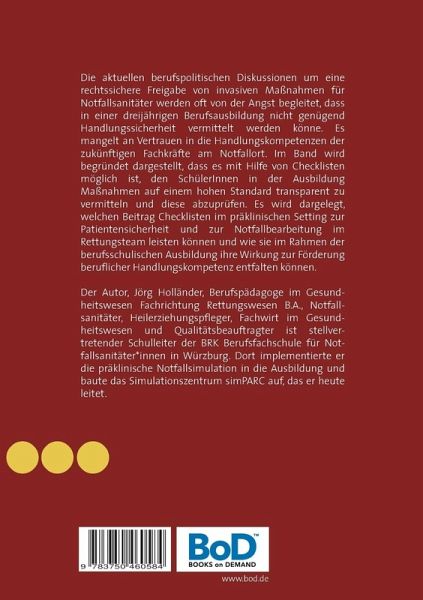 Die aktuellen berufspolitischen Diskussionen um eine rechtssichere Freigabe von invasiven Maßnahmen für Notfallsanitäter werden oft von der Angst begleitet, dass in einer dreijährigen Berufsausbildung nicht genügend Handlungssicherheit vermittelt werden könne. Es mangelt an Vertrauen in die Handlungskompetenzen der zukünftigen Fachkräfte am Notfallort. Im Band wird begründet dargestellt, dass es mit Hilfe von Checklisten möglich ist, den SchülerInnen in der Ausbildung Maßnahmen auf einem hohen Standard transparent zu vermitteln und diese abzuprüfen. Es wird dargelegt, welchen Beitrag Checklisten im präklinischen Setting zur Patientensicherheit und zur Notfallbearbeitung im Rettungsteam leisten können und wie sie im Rahmen der berufsschulischen Ausbildung ihre Wirkung zur Förderung beruflicher Handlungskompetenz entfalten können. Der Autor, Jörg Holländer, Berufspädagoge im Gesundheitswesen Fachrichtung Rettungswesen B.A., Notfallsanitäter, Heilerziehungspfleger, Fachwirt im Gesundheitswesen und Qualitätsbeauftragter ist stellvertretender Schulleiter der BRK Berufsfachschule für Notfallsanitäter_innen in Würzburg. Dort implementierte er die präklinische Notfallsimulation in die Ausbildung und baute das Simulationszentrum simPARC auf, das er heute leitet.