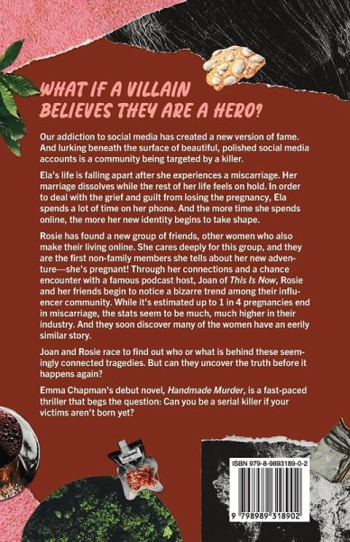 What if a villain believes they are a hero? Our addiction to social media has created a new version of fame. And lurking beneath the surface of beautiful, polished social media accounts is a community being targeted by a killer. Ela's life is falling apart after she experiences a miscarriage. Her marriage dissolves while the rest of her life feels on hold. In order to deal with the grief and guilt from losing the pregnancy, Ela spends a lot of time on her phone. And the more time she spends online, the more her new identity begins to take shape. Rosie has found a new group of friends, other women who also make their living online. She cares deeply for this group, and they are the first non-family members she tells about her new adventure-she's pregnant! Through her connections and a chance encounter with a famous podcast host, Joan of This Is Now, Rosie and her friends begin to notice a bizarre trend among their influencer community. While it's estimated up to 1 in 4 pregnancies end in miscarriage, the stats seem to be much, much higher in their industry. And they soon discover many of the women have an eerily similar story. Joan and Rosie race to find out who or what is behind these seemingly connected tragedies. But can they uncover the truth before it happens again? Emma Chapman's debut novel, Handmade Murder, is a fast-paced thriller that begs the question: Can you be a serial killer if your victims aren't born yet?