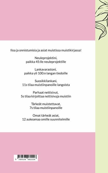 Iloa ja onnistumisia ja asiat muistissa muistikirjassa! Neuleprojektini, paikka 45:lle neuleprojektille Lankavarastoni, paikka yli 100:n langan tiedoille Suosikkilankani, 11s tilaa muistiinpanoille langoista Parhaat nettisivut, 5s tilaa kirjoittaa nettisivuja muistiin Tärkeät muistettavat, 7s tilaa muistiinpanoille Omat tärkeät asiat, 12 aukeamaa omille suunnitelmille