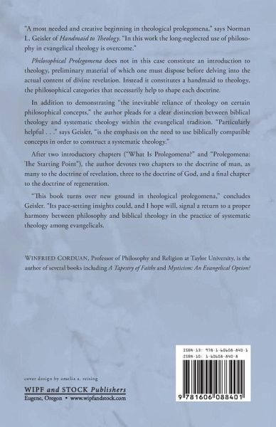 ""A most needed and creative beginning in theological prolegomena,"" says Norman L. Geisler of Handmaid to Theology. ""In this work the long-neglected use of philosophy in evangelical theology is overcome."" Philosophical Prolegomena does not in this case constitute an introduction to theology, preliminary material of which one must dispose before delving into the actual content of divine revelation. Instead it constitutes a handmaid to theology, the philosophical categories that necessarily help to shape each doctrine. In addition to demonstrating ""the inevitable reliance of theology on certain philosophical concepts,"" the author pleads for a clear distinction between biblical theology and systematic theology within the evangelical tradition. ""Particularly helpful . . ."" says Geisler, ""is the emphasis on the need to use biblically compatible concepts in order to construct a systematic theology."" After two introductory chapters (""What Is Prolegomena?"" and ""Prolegomena: The Starting Point""), the author devotes two chapters to the doctrine of man, as many to the doctrine of revelation, three to the doctrine of God, and a final chapter to the doctrine of regeneration. ""This book turns over new ground in theological prolegomena,"" concludes Geisler. ""Its pace-setting insights could, and I hope will, signal a return to a proper harmony between philosophy and biblical theology in the practice of systematic theology among evangelicals.