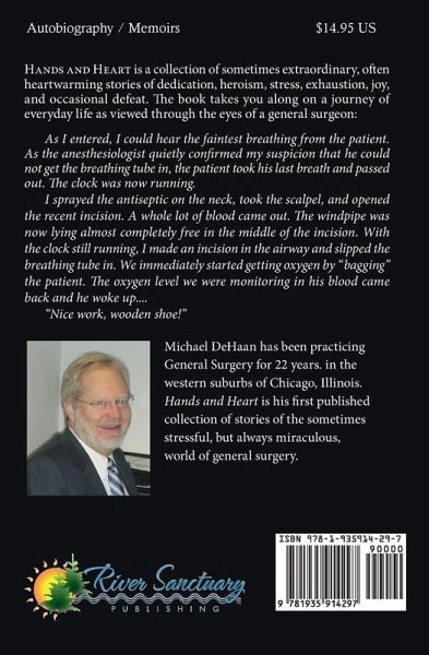 Hands and Heart is a collection of sometimes extraordinary, often heartwarming stories of dedication, heroism, stress, exhaustion, joy, and occasional defeat. The book takes you along on a journey of everyday life as viewed through the eyes of a general surgeon: As I entered, I could hear the faintest breathing from the patient. As the anesthesiologist quietly confirmed my suspicion that he could not get the breathing tube in, the patient took his last breath and passed out. The clock was now running. I sprayed the antiseptic on the neck, took the scalpel, and opened the recent incision. A whole lot of blood came out. The windpipe was now lying almost completely free in the middle of the incision. With the clock still running, I made an incision in the airway and slipped the breathing tube in. We immediately started getting oxygen by "bagging" the patient. The oxygen level we were monitoring in his blood came back and he woke up.... "Nice work, wooden shoe!" About the author: Michael DeHaan has been practicing general surgery for 22 years in the western suburbs of Chicago, Illinois. Hands and Heart is his first published collection of stories of the sometimes stressful, but always miraculous, world of general surgery.