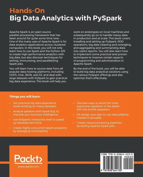 Use PySpark to easily crush messy data at-scale and discover proven techniques to create testable, immutable, and easily parallelizable Spark jobs Key Features: - Work with large amounts of agile data using distributed datasets and in-memory caching - Source data from all popular data hosting platforms, such as HDFS, Hive, JSON, and S3 - Employ the easy-to-use PySpark API to deploy big data Analytics for production Book Description: Apache Spark is an open source parallel-processing framework that has been around for quite some time now. One of the many uses of Apache Spark is for data analytics applications across clustered computers. In this book, you will not only learn how to use Spark and the Python API to create high-performance analytics with big data, but also discover techniques for testing, immunizing, and parallelizing Spark jobs. You will learn how to source data from all popular data hosting platforms, including HDFS, Hive, JSON, and S3, and deal with large datasets with PySpark to gain practical big data experience. This book will help you work on prototypes on local machines and subsequently go on to handle messy data in production and at scale. This book covers installing and setting up PySpark, RDD operations, big data cleaning and wrangling, and aggregating and summarizing data into useful reports. You will also learn how to implement some practical and proven techniques to improve certain aspects of programming and administration in Apache Spark. By the end of the book, you will be able to build big data analytical solutions using the various PySpark offerings and also optimize them effectively. What You Will Learn: - Get practical big data experience while working on messy datasets - Analyze patterns with Spark SQL to improve your business intelligence - Use PySpark s interactive shell to speed up development time - Create highly concurrent Spark programs by leveraging immutability - Discover ways to avoid the most expensive operation in the Spark API: the shuffle operation - Re-design your jobs to use reduceByKey instead of groupBy - Create robust processing pipelines by testing Apache Spark jobs Who this book is for: This book is for developers, data scientists, business analysts, or anyone who needs to reliably analyze large amounts of large-scale, real-world data. Whether you're tasked with creating your company's business intelligence function or creating great data platforms for your machine learning models, or are looking to use code to magnify the impact of your business, this book is for you.