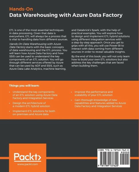 Leverage the power of Microsoft Azure Data Factory v2 to build hybrid data solutions Key Features Combine the power of Azure Data Factory v2 and SQL Server Integration Services Design and enhance performance and scalability of a modern ETL hybrid solution Interact with the loaded data in data warehouse and data lake using Power BI Book Description ETL is one of the essential techniques in data processing. Given data is everywhere, ETL will always be the vital process to handle data from different sources. Hands-On Data Warehousing with Azure Data Factory starts with the basic concepts of data warehousing and ETL process. You will learn how Azure Data Factory and SSIS can be used to understand the key components of an ETL solution. You will go through different services offered by Azure that can be used by ADF and SSIS, such as Azure Data Lake Analytics, Machine Learning and Databrick's Spark with the help of practical examples. You will explore how to design and implement ETL hybrid solutions using different integration services with a step-by-step approach. Once you get to grips with all this, you will use Power BI to interact with data coming from different sources in order to reveal valuable insights. By the end of this book, you will not only learn how to build your own ETL solutions but also address the key challenges that are faced while building them. What you will learn Understand the key components of an ETL solution using Azure Data Factory and Integration Services Design the architecture of a modern ETL hybrid solution Implement ETL solutions for both on-premises and Azure data Improve the performance and scalability of your ETL solution Gain thorough knowledge of new capabilities and features added to Azure Data Factory and Integration Services