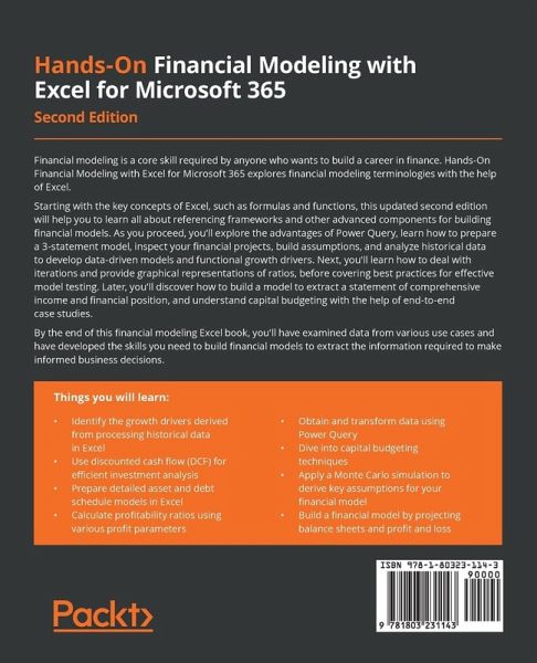 Explore a variety of Excel features, functions, and productivity tips for various aspects of financial modelingKey FeaturesExplore Excel's financial functions and pivot tables with this updated second edition Build an integrated financial model with Excel for Microsoft 365 from scratch Perform financial analysis with the help of real-world use cases Book Description Financial modeling is a core skill required by anyone who wants to build a career in finance. Hands-On Financial Modeling with Excel for Microsoft 365 explores financial modeling terminologies with the help of Excel. Starting with the key concepts of Excel, such as formulas and functions, this updated second edition will help you to learn all about referencing frameworks and other advanced components for building financial models. As you proceed, you'll explore the advantages of Power Query, learn how to prepare a 3-statement model, inspect your financial projects, build assumptions, and analyze historical data to develop data-driven models and functional growth drivers. Next, you'll learn how to deal with iterations and provide graphical representations of ratios, before covering best practices for effective model testing. Later, you'll discover how to build a model to extract a statement of comprehensive income and financial position, and understand capital budgeting with the help of end-to-end case studies. By the end of this financial modeling Excel book, you'll have examined data from various use cases and have developed the skills you need to build financial models to extract the information required to make informed business decisions.What you will learnIdentify the growth drivers derived from processing historical data in Excel Use discounted cash flow (DCF) for efficient investment analysis Prepare detailed asset and debt schedule models in Excel Calculate profitability ratios using various profit parameters Obtain and transform data using Power Query Dive into capital budgeting techniques Apply a Monte Carlo simulation to derive key assumptions for your financial model Build a financial model by projecting balance sheets and profit and loss Who this book is for This book is for data professionals, analysts, traders, business owners, and students who want to develop and implement in-demand financial modeling skills in their finance, analysis, trading, and valuation work. Even if you don't have any experience in data and statistics, this book will help you get started with building financial models. Working knowledge of Excel is a prerequisite.Table of ContentsAn Introduction to Financial Modeling and Excel Steps for Building a Financial Model Formulas and Functions - Completing Modeling Tasks with a Single Formula The Referencing Framework in Excel An Introduction to Power Query Understanding Project and Building Assumptions Asset and Debt Schedules Preparing a Cash Flow Statement Ratio Analysis Valuation Model Testing for Reasonableness and Accuracy Case Study 1 - Building a Model to Extract a Balance Sheet and Profit and Loss from a Trial Balance Case Study 2 - Creating a Model for Capital Budgeting