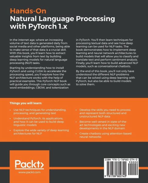 Become a proficient NLP data scientist by developing deep learning models for NLP and extract valuable insights from structured and unstructured data Key Features Get to grips with word embeddings, semantics, labeling, and high-level word representations using practical examples Learn modern approaches to NLP and explore state-of-the-art NLP models using PyTorch Improve your NLP applications with innovative neural networks such as RNNs, LSTMs, and CNNs Book Description In the internet age, where an increasing volume of text data is generated daily from social media and other platforms, being able to make sense of that data is a crucial skill. With this book, you’ll learn how to extract valuable insights from text by building deep learning models for natural language processing (NLP) tasks. Starting by understanding how to install PyTorch and using CUDA to accelerate the processing speed, you’ll explore how the NLP architecture works with the help of practical examples. This PyTorch NLP book will guide you through core concepts such as word embeddings, CBOW, and tokenization in PyTorch. You’ll then learn techniques for processing textual data and see how deep learning can be used for NLP tasks. The book demonstrates how to implement deep learning and neural network architectures to build models that will allow you to classify and translate text and perform sentiment analysis. Finally, you’ll learn how to build advanced NLP models, such as conversational chatbots. By the end of this book, you’ll not only have understood the different NLP problems that can be solved using deep learning with PyTorch, but also be able to build models to solve them. What you will learn Use NLP techniques for understanding, processing, and generating text Understand PyTorch, its applications and how it can be used to build deep linguistic models Explore the wide variety of deep learning architectures for NLP Develop the skills you need to process and represent both structured and unstructured NLP data Become well-versed with state-of-the-art technologies and exciting new developments in the NLP domain Create chatbots using attention-based neural networks Who this book is for This PyTorch book is for NLP developers, machine learning and deep learning developers, and anyone interested in building intelligent language applications using both traditional NLP approaches and deep learning architectures. If you’re looking to adopt modern NLP techniques and models for your development projects, this book is for you. Working knowledge of Python programming, along with basic working knowledge of NLP tasks, is required.