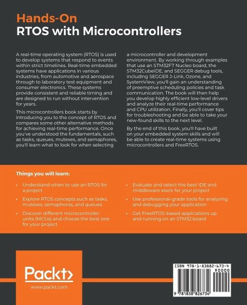 Build a strong foundation in designing and implementing real-time systems with the help of practical examples Key Features Get up and running with the fundamentals of RTOS and apply them on STM32 Enhance your programming skills to design and build real-world embedded systems Get to grips with advanced techniques for implementing embedded systems Book Description A real-time operating system (RTOS) is used to develop systems that respond to events within strict timelines. Real-time embedded systems have applications in various industries, from automotive and aerospace through to laboratory test equipment and consumer electronics. These systems provide consistent and reliable timing and are designed to run without intervention for years. This microcontrollers book starts by introducing you to the concept of RTOS and compares some other alternative methods for achieving real-time performance. Once you've understood the fundamentals, such as tasks, queues, mutexes, and semaphores, you'll learn what to look for when selecting a microcontroller and development environment. By working through examples that use an STM32F7 Nucleo board, the STM32CubeIDE, and SEGGER debug tools, including SEGGER J-Link, Ozone, and SystemView, you'll gain an understanding of preemptive scheduling policies and task communication. The book will then help you develop highly efficient low-level drivers and analyze their real-time performance and CPU utilization. Finally, you'll cover tips for troubleshooting and be able to take your new-found skills to the next level. By the end of this book, you'll have built on your embedded system skills and will be able to create real-time systems using microcontrollers and FreeRTOS. What you will learn Understand when to use an RTOS for a project Explore RTOS concepts such as tasks, mutexes, semaphores, and queues Discover different microcontroller units (MCUs) and choose the best one for your project Evaluate and select the best IDE and middleware stack for your project Use professional-grade tools for analyzing and debugging your application Get FreeRTOS-based applications up and running on an STM32 board Who this book is for This book is for embedded engineers, students, or anyone interested in learning the complete RTOS feature set with embedded devices. A basic understanding of the C programming language and embedded systems or microcontrollers will be helpful.
