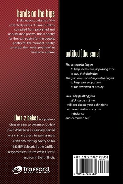 hands on the hips is the newest volume of the collected poems of Jhon Z. Baker, compiled from published and unpublished poems. This is poetry for the real, poetry for the people, poetry for the moment, poetry to satiate the needs, poetry of an American outlaw. untitled (the sane) The sane point fingers to keep themselves appearing sane to stay their definition The glamorous point bejeweled fingers to keep their proportions as the definition of beauty Well, stop pointing your sticky fingers at me I will not obsess your definitions I am comfortable in my own imbalance and deformed self