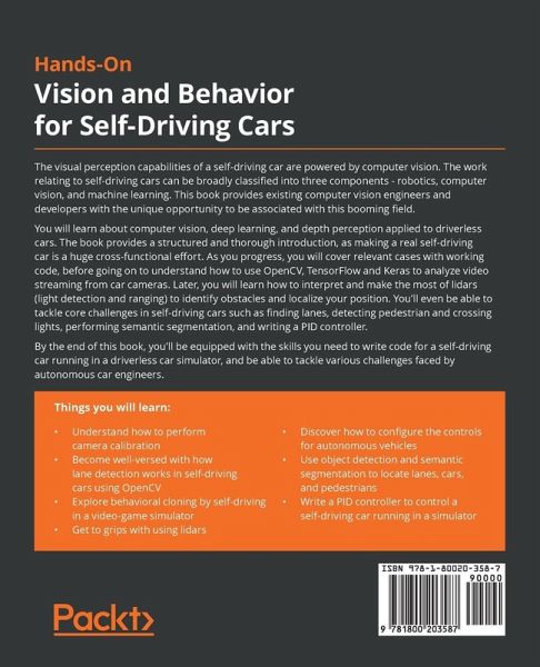 A practical guide to learning visual perception for self-driving cars for computer vision and autonomous system engineers Key FeaturesExplore the building blocks of the visual perception system in self-driving cars Identify objects and lanes to define the boundary of driving surfaces using open-source tools like OpenCV and Python Improve the object detection and classification capabilities of systems with the help of neural networks Book Description The visual perception capabilities of a self-driving car are powered by computer vision. The work relating to self-driving cars can be broadly classified into three components - robotics, computer vision, and machine learning. This book provides existing computer vision engineers and developers with the unique opportunity to be associated with this booming field. You will learn about computer vision, deep learning, and depth perception applied to driverless cars. The book provides a structured and thorough introduction, as making a real self-driving car is a huge cross-functional effort. As you progress, you will cover relevant cases with working code, before going on to understand how to use OpenCV, TensorFlow and Keras to analyze video streaming from car cameras. Later, you will learn how to interpret and make the most of lidars (light detection and ranging) to identify obstacles and localize your position. You'll even be able to tackle core challenges in self-driving cars such as finding lanes, detecting pedestrian and crossing lights, performing semantic segmentation, and writing a PID controller. By the end of this book, you'll be equipped with the skills you need to write code for a self-driving car running in a driverless car simulator, and be able to tackle various challenges faced by autonomous car engineers. What You Will LearnUnderstand how to perform camera calibration Become well-versed with how lane detection works in self-driving cars using OpenCV Explore behavioral cloning by self-driving in a video-game simulator Get to grips with using lidars Discover how to configure the controls for autonomous vehicles Use object detection and semantic segmentation to locate lanes, cars, and pedestrians Write a PID controller to control a self-driving car running in a simulator Who this book is for This book is for software engineers who are interested in learning about technologies that drive the autonomous car revolution. Although basic knowledge of computer vision and Python programming is required, prior knowledge of advanced deep learning and how to use sensors (lidar) is not needed.