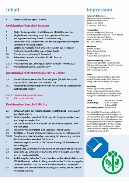 handwerk Ostsachsen - Regionaler Informationsdienst der Kreishandwerkerschaften Bautzen und Görlitz5. Jahrgang April 2025 1. Quartal Herausgeber: Kreishandwerkerschaft Bautzen, Wallstr. 8, 02625 Bautzen, Tel.: 03591 522730Kreishandwerkerschaft Görlitz, Melanchthonstr. 19, 02826 Görlitz, Tel.: 03581 877451Redaktion: Teil KHS Bautzen: Sabine Gotscha-SchockTeil KHS Görlitz: Michael Rönsch, Ines Göhlich Gesamtherstellung & Satz: Weltbuch Verlag GmbH - verantwortlich: Dirk Kohl (COB), Kontakt: Tel.: 0351 3361085, Mail: verlag@weltbuch.com, Web: www.weltbuch.comFotos: Kreishandwerkerschaft Görlitz & Bautzen sowie Bildnachweise im Inhalt, Weltbuch Verlag, DEKA Mediendesign, smarterpixDruck: PostModern, DresdenErscheinungsweise: vierteljährlichDie HANDWERK Ostsachsen und alle in ihr enthaltenen Beiträge und Abbildungen sind urheberrechtlich geschützt. Nachdruck auch auszugsweise ist nur mit Genehmigung des Herausgebers statthaft. Namentlich gekennzeichnete Beiträge geben die Meinung des Autors wieder. Für unaufgefordert eingesandte Bilder und Beiträge kann keine Haftung übernommen werden.