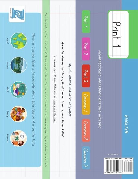 TITLE: Learn by Handwriting, Practice Workbook Memorescribe. THEME: United States of America States and Capitals VERSION: Print - Level 1 - Landscape - English - 120 Pages. MEMORESCRIBE #: USSP1LE Writers will enjoy practicing and developing their personal, unique handwriting style with easy-to-follow exercises while they learn and review the 50 States and Capitals of the United States of America. 120 pages include enjoyable handwriting practice exercises, interesting facts about the 50 states, and fun brain break activities designed to reinforce the handwritten information.Comprehensive exercises for memory, focus, hand control, and stress relief. Choose a workbook based on ability or handwriting skills and upgrade as handwriting improves. From students to professionals, from children to senior adults. Valuable tools for activities such as school curriculum support and homework, homeschooling activity, productive leisure time, school extracurricular activities, or just staying busy on a trip. Recommended and used as a handwriting relearning therapy tool and fine motor exercise. Several research say that actively working with the fine motor system writing by hand has positive effects on learning and memory. We remember better when we learn through repetition, we improve focus, the information stays in your mind longer, we learn faster. Redoing a task allows the brain to make new connections, improving performance. Whether looking to support a foundational educational skill, boost brain function, or practice better learning and recalling information, Memorescribe has an option for every writer! Memorescribe Learn by Handwriting, Practice Workbooks offer writers the opportunity to learn and review fun and engaging educational topics using structured practice exercises designed to help them persistently write more clearly and beautifully. With Memorescribe, choose a handwriting style and text size. For handwriting style, choose between books in print and cursive. For handwriting text size, choose from books skill level 1, level 2, or level 3 (instead of age) in your selected style. Books available in English, Spanish, and other languages. More information at Memorescribe.com.
