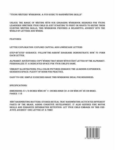¿¿¿¿ "Young Writers' Workbook: A Fun Guide to Handwriting Skills" Unlock the magic of writing with our engaging workbook designed for young learners! Whether your child is just starting to print or wants to refine their existing writing skills, this workbook provides a delightful journey into the world of letters and words. Features: Letter Exploration: Explore capital and lowercase letters Step-by-Step Guidance: Follow-the-arrow diagrams demonstrate how to form each letter. Alphabet Adventures: Copy words that begin with every letter of the alphabet. Personalize It: A dedicated space for your child's name. Vibrant Illustrations: Full-color pictures enhance the learning experience. Generous Space: Plenty of room for practice. Easy-to-Use: Simple exercises make this workbook ideal for beginners. Specifications:Dimensions: 8-1/2 inches wide by 11 inches high (21.6 cm wide by 28 cm high). Pages: 118 ¿¿¿¿ Why Handwriting Matters: Studies reveal that handwriting activates different parts of the brain, aiding cognitive development. It also refines fine motor skills and enhances information retention. Let your child embark on this creative journey-one letter at a time!
