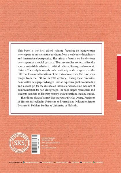 This book is the first edited volume focusing on handwritten newspapers as an alternative medium from a wide interdisciplinary and international perspective. The primary focus is on handwritten newspapers as a social practice. The case studies contextualize the source materials in relation to political, cultural, literary, and economic history. The analysis reveals both continuity and change across the different forms and functions of the textual materials. The time span ranges from the 16th to the 20th century. During these centuries, handwritten newspapers changed from an expensive public commodity and a social gift for the elites to an internal or clandestine medium of communication for non-elite groups. The book targets researchers and students in media and literary history, and cultural and literacy studies.