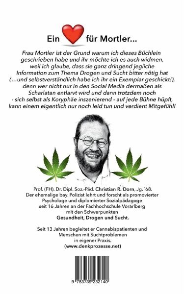 Ein Herz für Mortler!Frau Mortler ist der Grund; warum ich dieses Büchlein geschrieben habe und ihr möchte ich es auch widmen, weil ich glaube, dass sie ganz dringend jegliche Information zum Thema Drogen und Sucht bitter nötig hat (...und selbstverständlich habe ich ihr ein Exemplar geschickt!), denn wer nicht nur in den Social Media dermaßen als Scharlatan entlarvt wird und dann trotzdem noch - sich selbst als Koryphäe inszenierend - auf jede Bühne hüpft, kann einem eigentlich nur noch leidtun und verdient Mitgefühl!