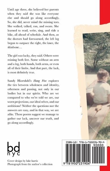 Until age three, she believed her parents when they said she was like everyone else and should go along accordingly. So, she did, never mind the missing toes. She walked, talked, ran, and swam. She learned to read, write, sing, and ride a bike, all ahead of schedule. And then, as the doctors had forewarned, the left leg began to outpace the right, the knee, the shinbone... The girl was lucky, they said. Others were missing both feet. Some without an arm and a leg, both hands, both arms, or even all of their limbs. And that part, the luck, is most definitely true. Sandy Hiortdahl's Hang Five explores the ties between wholeness and identity, otherness and passing, not only in our bodies but in our spirits. Who are we compared to who we're told we are, our worst projections, our ideal selves, and our ambitions? Neither the questions nor the answers are easy, and in that way, we are alike. These poems suggest we manage to gather our luck, uncover our truth, and go along accordingly.