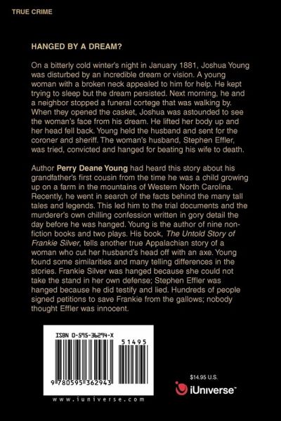 HANGED BY A DREAM? On a bitterly cold winter's night in January 1881, Joshua Young was disturbed by an incredible dream or vision. A young woman with a broken neck appealed to him for help. He kept trying to sleep but the dream persisted. Next morning, he and a neighbor stopped a funeral cortege that was walking by. When they opened the casket, Joshua was astounded to see the woman's face from his dream. He lifted her body up and her head fell back. Young held the husband and sent for the coroner and sheriff. The woman's husband, Stephen Effler, was tried, convicted and hanged for beating his wife to death. Author Perry Deane Young had heard this story about his grandfather's first cousin from the time he was a child growing up on a farm in the mountains of Western North Carolina. Recently, he went in search of the facts behind the many tall tales and legends. This led him to the trial documents and the murderers own chilling confession written in gory detail the day before he was hanged. Young is the author of nine non-fiction books and two plays. His book, The Untold Story of Frankie Silver, tells another true Appalachian story of a woman who cut her husband's head off with an axe. Young found some similarities and many telling differences in the stories. Frankie Silver was hanged because she could not take the stand in her own defense; Stephen Effler was hanged because he did testify and lied. Hundreds of people signed petitions to save Frankie from the gallows; nobody thought Effler was innocent.