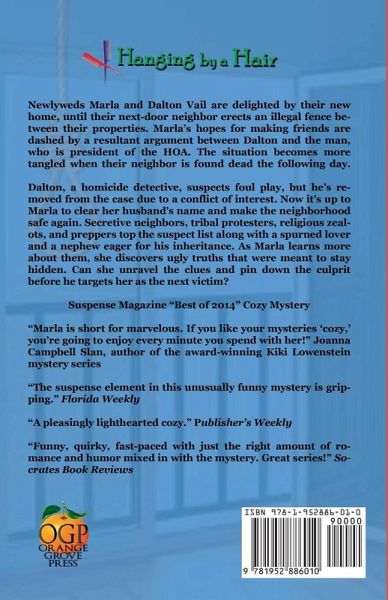Snarky neighbors, sordid secrets, and community politics play a role in this madcap murder mystery that will keep you guessing until the end. Newlyweds Marla and Dalton Vail are delighted by their new home, until their next-door neighbor erects an illegal fence between their properties. Marla's hopes for making friends are dashed by a resultant argument between Dalton and the man, who is president of the HOA. The situation becomes more tangled when their neighbor is found dead the following day. Dalton, a homicide detective, suspects foul play, but he's removed from the case due to a conflict of interest. Now it's up to Marla to clear her husband's name and make the neighborhood safe again. Secretive neighbors, tribal protesters, religious zealots, and preppers top the suspect list along with a spurned lover and a nephew eager for his inheritance. As Marla learns more about them, she discovers ugly truths that were meant to stay hidden. Can she unravel the clues and pin down the culprit before he targets her as the next victim? Bonus Content: Reader Discussion Guide Five Easy Recipes Peril by Ponytail Excerpt "Marla is short for marvelous. If you like your mysteries 'cozy,' you're going to enjoy every minute you spend with her!" Joanna Campbell Slan, author of the award-winning Kiki Lowenstein mystery series Suspense Magazine "Best of 2014" Cozy Mystery Night Owl Reviews 5 Stars Top Pick Murder on the Beach Mystery Bookstore Bestseller Hanging by a Hair was originally published by Five Star Publishing (Gale/Cengage). This Author's Edition has been updated with added bonus materials.