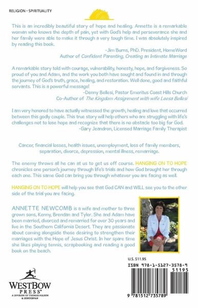 This is an incredibly beautiful story of hope and healing. Annette is a remarkable woman who knows the depth of pain, yet with God’s help and perseverance she and her family were able to make it through a very tough time. I was absolutely inspired by reading this book. -Jim Burns, PhD. President, HomeWord Author of Confident Parenting, Creating an Intimate Marriage A remarkable story told with courage, vulnerability, honesty, hope, and forgiveness. So proud of you and Adam, and the work you both have sought and found in and through the journey of God’s truth, grace, healing, and restoration. Well done, good and faithful servants. This is a powerful message! -Denny Bellesi, Pastor Emeritus Coast Hills Church Co-Author of The Kingdom Assignment with wife Leesa Bellesi I am very honored to have actually witnessed the growth, healing and love that occurred between this godly couple. This true story will help others who are struggling with life’s challenges not to lose hope and recognize that there is no obstacle too big for God. -Gary Jeandron, Licensed Marriage Family Therapist Cancer, financial losses, health issues, unemployment, loss of family members, separation, divorce, depression, mental illness, remarriage. The enemy throws all he can at us to get us off course. Hanging On to Hope chronicles one person’s journey through life’s trials and how God brought her through each one. This same God can bring you through whatever you are facing as well. HANGING ON TO HOPE will help you see that God CAN and WILL see you to the other side of the trial you are facing.