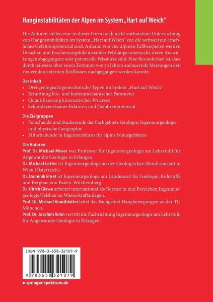 Die Autoren stellen eine in dieser Form noch nicht vorhandene Untersuchung von Hanginstabilitäten im System "Hart auf Weich" vor, die weltweit ein erhebliches Gefahrenpotenzial sind. Anhand von vier alpinen Fallbeispielen werden Ursachen und Erscheinungsbild instabiler Felshänge untersucht, deren Auswirkungen abgegangene oder potenzielle Felsstürze sind. Eine Besonderheit ist, dass durch teilweise über einen Zeitraum von 30 Jahren andauernde Messungen den steuernden externen Einflüssen nachgegangen werden konnte.