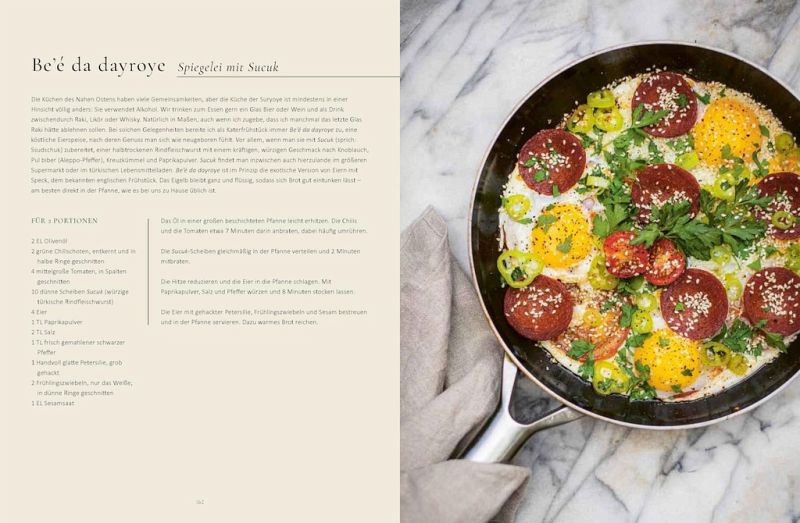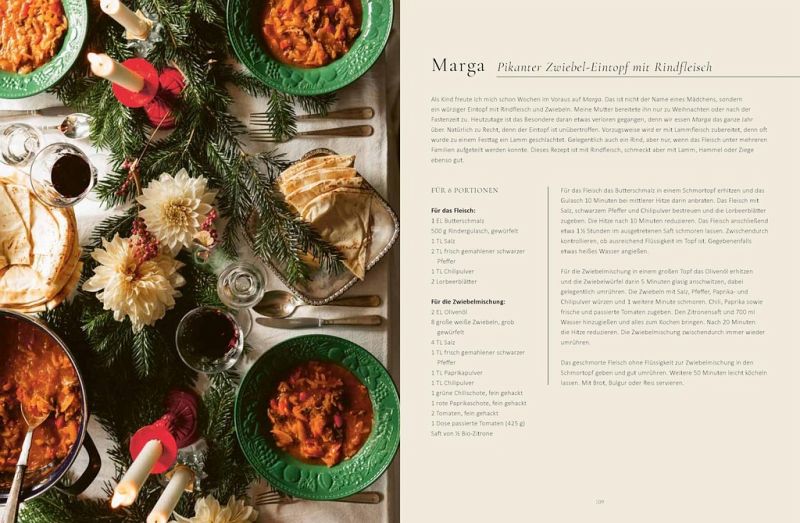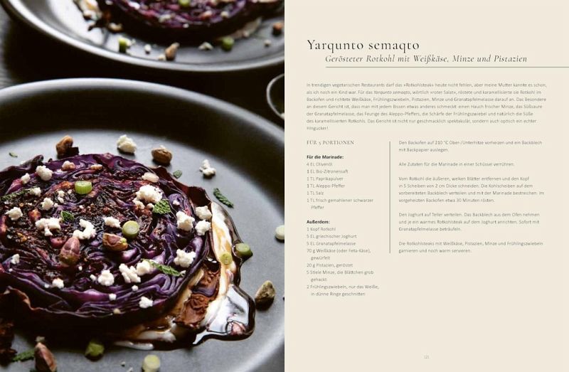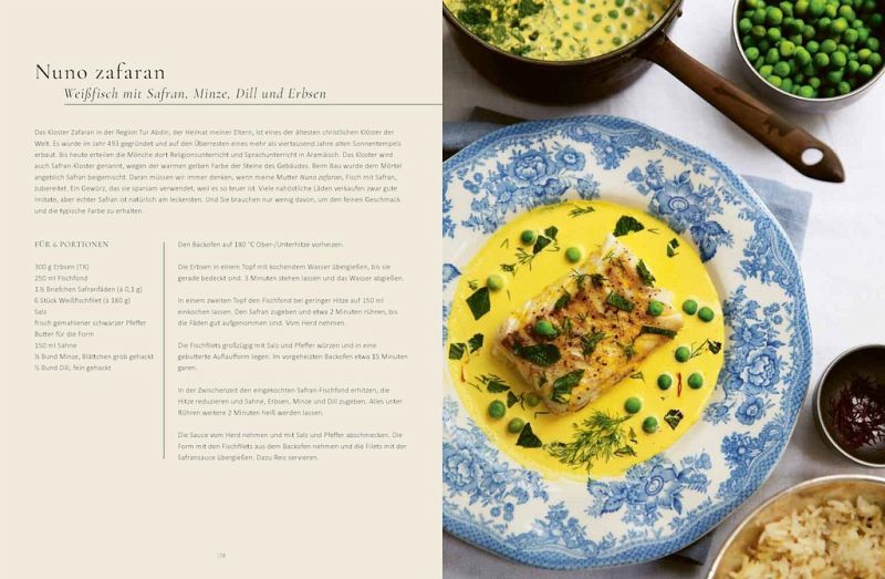 Immer auf dem Tisch: Khase da bosine - Joghurt-Gurkensalat mit Dill; Dawqo hamig - Fladenbrot aus der Pfanne; Yarqunto - einfacher assyrischer Gemüsesalat Die Klassiker: Samborakat - gefüllte Teighörnchen; Tawa - Auflauf mit Hackfleisch und Gemüse; Kibbeh seniye - Bulgur-Hackfleischkuchen aus dem Ofen; Basle hashye - gedünstete gefüllte Zwiebel; Lahmo do tanuro - Brot aus dem Ofen Suppe und Eintopf: Hemse - Kichererbsensuppe; Bamya - Okraeintopf mit Rindfleisch; Dobo - Lammkeule mit Knoblauch und Piment; Marga - würziger Zwiebel-Eintopf mit Rindfleisch Gemüse und mehr: Yarqunto semaqto - gerösteter Rotkohl mit Weißkäse, Minze und Pistazien; Yarqunto Tabouleh - Petersiliensalat; Mujadarah - Linsen und Reis mit karamellisierten Zwiebeln; Yarqunto da saldemee - Rote-Bete-Salat mit Kichererbsen; Muhammara - pikante geröstete Paprikapaste mit Granatapfel Fleisch und Fisch: Basro 'al dawqo - gewürztes Hackfleisch auf Mini-Fladenbrot; Gyothe melye - gebratenes gefülltes Huhn mit Reis und Gemüse; Nuno zafaran - Fisch mit Safran, Minze, Dill, Erbsen Köstlich süß: Seble - Streuselkuchen mit Walnüssen, Kokosnuss und Aprikosenmarmelade; Harise - Grießkuchen mit Mandeln und Orangen