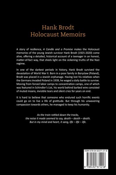 The Troubling but ultimately Triumphant Memoirs of Holocaust Survivor Hank Brodt A story of resilience, Hank Brodt Holocaust Memoirs - A Candle and a Promise makes the memories of Holocaust survivor Hank Brodt come alive. It offers a detailed historical account of being a Jewish teenager under the Nazi regime, shedding light on sickening truths in an honest, matter-of-fact way. Hank Brodt lived through one of the darkest periods of human history and survived the devastation of World War II. Born in 1925 into a poor family in Boryslaw (Poland), he was placed in a Jewish orphanage. Losing his family when the Germans invaded Poland, he waged a daily battle to survive. Moving from forced labor camps to concentration camps, one of which features in Schindler's List, his world behind the barbed wire consisted of quiet resistance, invisible tears and silent cries for years on end. This story of survival includes rare photographs from the United States Holocaust Memorial Museum that powerfully illustrate these intimate and shocking memoirs. One recently discovered picture shows Hank Brodt in prison uniform removing the dead on carts at the liberated Ebensee concentration camp on May 7, 1945. It is hard to believe that someone who endured such horrific events could go on to live a life of gratitude. Through his unwavering compassion towards others, Hank Brodt managed to keep his humanity and find a way to move forward. After the Second World War, Hank Brodt testified at the trial of Nazi war criminal Amon Goeth in Dachau, Germany. He has joined the March of the Living since 2006, walking from Auschwitz to Birkenau on Yom Hashoah to pay tribute to the millions that died. Lighting the candle, he made a promise to himself to always answer the call to talk. Hank Brodt's Holocaust memoirs are a necessary reminder of one of the ugliest times in the history of human civilization.