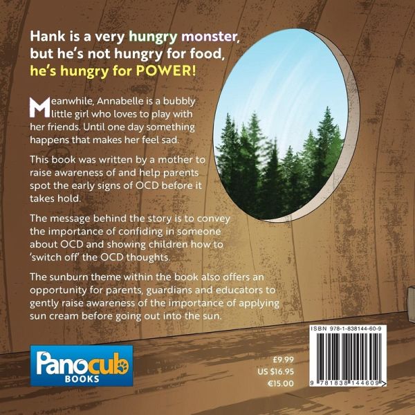 Hank is a very hungry monster, but he's not hungry for food, he's hungry for POWER! Meanwhile, Annabelle is a bubbly little girl who loves to play with her friends. Until one day something happens that makes her feel sad. This book was written by a mother to raise awareness of and help parents spot the early signs of OCD before it takes hold. The message behind the story is to convey the importance of confiding in someone about OCD and showing children how to 'switch off' the OCD thoughts. The sunburn theme within the book also offers an opportunity for parents, guardians and educators to gently raise awareness of the importance of applying sun cream before going out into the sun.