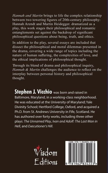 Hannah and Martin brings to life the complex relationship between two towering figures of 20th-century philosophy: Hannah Arendt and Martin Heidegger. dramatized as a play, this work stages their philosophical and romantic entanglements set against the backdrop of significant philosophical questions about being, truth, and ethics. Stephen Vicchio uses their relationship, complicated by Heidegger's involvement with the Nazi party and Arendt's Jewish identity, to serve as a powerful narrative to explore these questions. In addition to the play, several essays are included that dissect the philosophical and moral dilemmas presented in the drama. These essays cover a wide range of topics including the nature of human suffering, the complexities of love as discussed in classical and Christian traditions, and the ethical implications of philosophical thought. Through its blend of drama and philosophical inquiry, Hannah & Martin challenges the audience to reflect on the interplay between personal history and philosophical thought, and the ways in which this shapes our understanding of morality and existence.