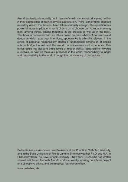 Arendt understands morality not in terms of maxims or moral principles, neither in their abstract nor in their relativistic acceptation. There is an original question raised by Arendt that has not been taken seriously enough. This question has powerful moral implications, for it directs us to choose our "company among men, among things, among thoughts, in the present as well as in the past". This book is concerned with an ethics based on the visibility of our words and deeds, in which, apart our intentions, appearance is ethically relevant. In the ethics of personal responsibility stands a fundamental dimension of choice able to bridge the self and the world, consciousness and experience. This ethics takes into account three levels of responsibility: responsibility towards ourselves, or how we make our presence in the world; responsibility to judge; and responsibility to the world through the consistency of our actions.