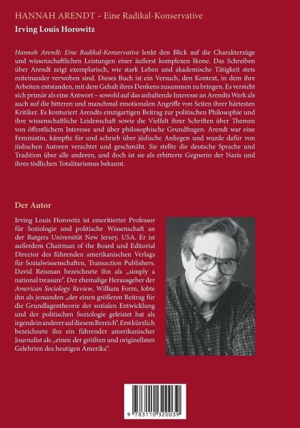 Hannah Arendt: Eine Radikal-Konservative lenkt den Blick auf die Charakterzüge und wissenschaftlichen Leistungen einer äußerst komplexen Ikone. Das Schreiben über Arendt zeigt exemplarisch, wie stark Leben und akademische Tätigkeit stets miteinander verwoben sind. Dieses Buch ist ein Versuch, den Kontext, in dem ihre Arbeiten entstanden, mit dem Gehalt ihres Denkens zusammen zu bringen. Es versteht sich primär als eine Antwort - sowohl auf das anhaltende Interesse an Arendts Werk als auch auf die bitteren und manchmal emotionalen Angriffe von Seiten ihrer härtesten Kritiker. Es konturiert Arendts einzigartigen Beitrag zur politischen Philosophie und ihre wissenschaftliche Leidenschaft sowie die Vielfalt ihrer Schriften über Themen von öffentlichem Interesse und über philosophische Grundfragen. Arendt war eine Feministin, kämpfte für und schrieb über jüdische Anliegen und wurde dafür von jüdischen Autoren verachtet und geschmäht. Sie stellte die deutsche Sprache und Tradition über alle anderen, und doch ist sie als erbitterte Gegnerin der Nazis und ihres tödlichen Totalitarismus bekannt.