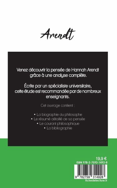 Venez découvrir la pensée d'Hannah Arendt grâce à une analyse philosophique de référence ! Écrite par un spécialiste universitaire, cette étude est recommandée par de nombreux enseignants. Cet ouvrage contient notamment la biographie du philosophe, le résumé détaillé de sa pensée, ainsi que l'analyse de son courant philosophique. Retrouvez tous nos titres sur : www.fichedelecture.fr.