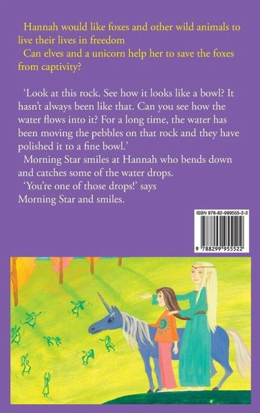 Hannah would like foxes and other wild animals to live their lives in freedom. Can elves and a unicorn help her to save the foxes from captivity? ‘Look at this rock. See how it looks like a bowl? It hasn’t always been like that. Can you see how the water flows into it? For a long time, the water has been moving the pebbles on that rock and they have polished it to a fine bowl.’ Morning Star smiles at Hannah who bends down and catches some of the water drops. ‘You're one of those drops!’ says Morning Star and smiles.