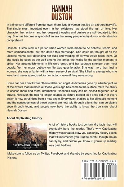 If you want to discover the captivating history of Hannah Duston, then keep reading... In a time very different from our own, there lived a woman that led an extraordinary life. The single most important event in her existence has stood the test of time. Her character, her actions, and her deepest thoughts and desires are still debated to this day. She has become a symbol of an era that many people today do not understand or comprehend. Hannah Duston lived in a period when women were meant to be delicate, feeble, and more compassionate, but she defied this stereotype. She could be thought of as the ultimate mama bear defending her cubs and warding off all who would harm them. Or she could be seen as the wolf among the lambs that waits for the perfect moment to strike. Her accomplishments in life were great, and her courage stronger than most people. Yet her moral outlook on life was questionable. She was more than just a woman; she was a fighter with a keen sense of survival. She killed to avenge who she loved and never apologized for her actions, even if they were wrong. In Hannah Duston: A Captivating Guide to the First American Woman to Have a Statue Built in Her Honor, you will discover topics such as English, French, and Native Americans: Frenemies for Decades Hannah's Early Life The Fateful Raid on Haverhill Hannah's Zero Hour Merrimack River Massacre Hannah's Final Reflection Hannah Duston Memorials The Ugly Side of Hannah Controversial Candor And much, much more! So if you want to learn more about Hannah Duston, scroll up and click the "add to cart" button!
