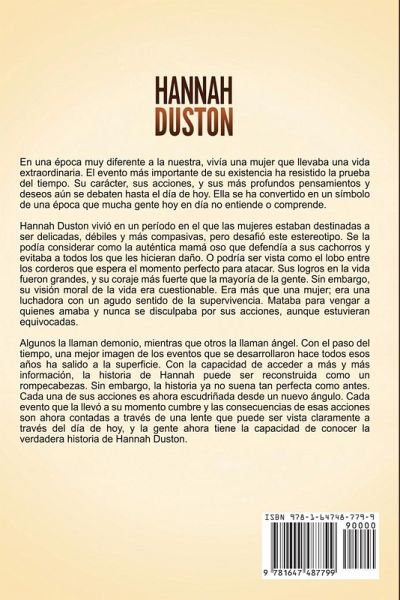 Si desea descubrir la cautivadora historia de Hannah Duston, entonces siga leyendo... En una época muy diferente a la nuestra, vivía una mujer que llevaba una vida extraordinaria. El evento más importante de su existencia ha resistido la prueba del tiempo. Su carácter, sus acciones, y sus más profundos pensamientos y deseos aún se debaten hasta el día de hoy. Ella se ha convertido en un símbolo de una época que mucha gente hoy en día no entiende o comprende. Hannah Duston vivió en un período en el que las mujeres estaban destinadas a ser delicadas, débiles y más compasivas, pero desafió este estereotipo. Se la podía considerar como la auténtica mamá oso que defendía a sus cachorros y evitaba a todos los que les hicieran daño. O podría ser vista como el lobo entre los corderos que espera el momento perfecto para atacar. Sus logros en la vida fueron grandes, y su coraje más fuerte que la mayoría de la gente. Sin embargo, su visión moral de la vida era cuestionable. Era más que una mujer; era una luchadora con un agudo sentido de la supervivencia. Mataba para vengar a quienes amaba y nunca se disculpaba por sus acciones, aunque estuvieran equivocadas. En Hannah Duston: Una guía fascinante sobre la primera mujer americana en tener una estatua construida en su honor, descubrirá temas como:Ingleses, franceses y nativos americanos: Frenémicos por décadas Los comienzos de la vida de Hannah El fatídico asalto a Haverhill La Hora Cero de Hannah La masacre del río Merrimack La reflexión final de Hannah Memorias de Hannah Duston El lado oscuro de Hannah Candor polémico ¡Y mucho, mucho más! ¡Obtenga este libro ahora para aprender más sobre Hannah Duston!