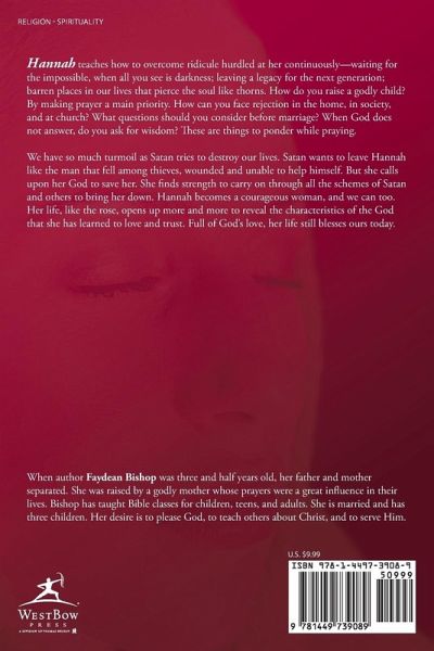 Hannah teaches how to overcome ridicule hurdled at her continuously-waiting for the impossible, when all you see is darkness; leaving a legacy for the next generation; barren places in our lives that pierce the soul like thorns. How do you raise a godly child? By making prayer a main priority. How can you face rejection in the home, in society, and at church? What questions should you consider before marriage? When God does not answer, do you ask for wisdom? These are things to ponder while praying. We have so much turmoil as Satan tries to destroy our lives. Satan wants to leave Hannah like the man that fell among thieves, wounded and unable to help himself. But she calls upon her God to save her. She finds strength to carry on through all the schemes of Satan and others to bring her down. Hannah becomes a courageous woman, and we can too. Her life, like the rose, opens up more and more to reveal the characteristics of the God that she has learned to love and trust. Full of God's love, her life still blesses ours today.