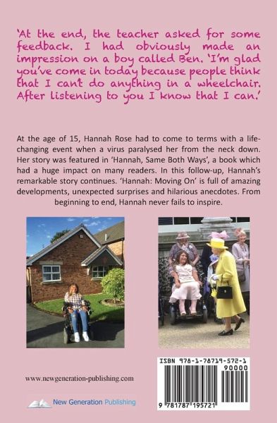 'At the end, the teacher asked for some feedback. I had obviously made an impression on a boy called Ben. 'I'm glad you've come in today because people think that I can't do anything in a wheelchair. After listening to you I know that I can.' At the age of 15, Hannah Rose had to come to terms with a life-changing event when a virus paralysed her from the neck down. Her story was featured in 'Hannah, Same Both Ways', a book which had a huge impact on many readers. In this follow-up, Hannah's remarkable story continues. 'Hannah: Moving On' is full of amazing developments, unexpected surprises and hilarious anecdotes. From beginning to end, Hannah never fails to inspire.