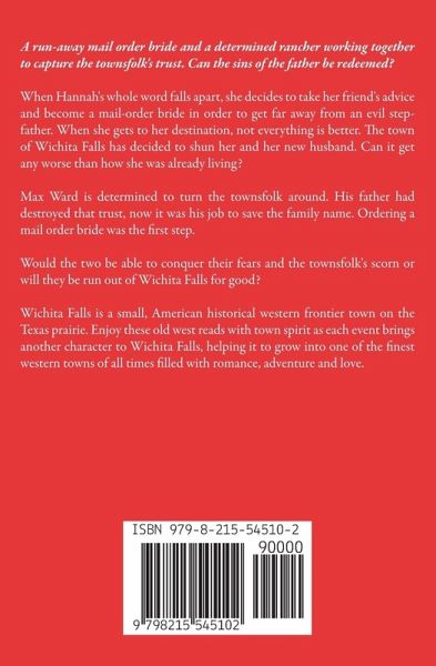 A run-away mail order bride and a determined rancher working together to capture the townsfolk's trust. Can the sins of the father be redeemed? When Hannah's whole word falls apart, she decides to take her friend's advice and become a mail-order bride in order to get far away from an evil step-father. When she gets to her destination, not everything is better. The town of Wichita Falls has decided to shun her and her new husband. Can it get any worse than how she was already living? Max Ward is determined to turn the townsfolk around. His father had destroyed that trust, now it was his job to save the family name. Ordering a mail order bride was the first step. Would the two be able to conquer their fears and the townsfolk's scorn or will they be run out of Wichita Falls for good? Wichita Falls is a small, American historical western frontier town on the Texas prairie. Enjoy these old west reads with town spirit as each event brings another character to Wichita Falls, helping it to grow into one of the finest western towns of all times filled with romance, adventure and love.