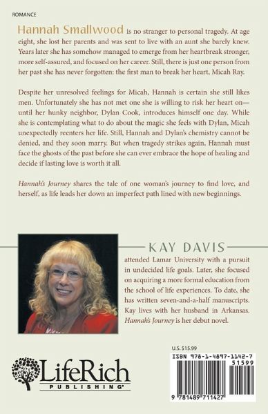Hannah Smallwood is no stranger to personal tragedy. At age eight, she lost her parents and was sent to live with an aunt she barely knew. Years later she has somehow managed to emerge from her heartbreak stronger, more self-assured, and focused on her career. Still, there is just one person from her past she has never forgotten: the first man to break her heart, Micah Ray. Despite her unresolved feelings for Micah, Hannah is certain she still likes men. Unfortunately she has not met one she is willing to risk her heart on-until her hunky neighbor, Dylan Cook, introduces himself one day. While she is contemplating what to do about the magic she feels with Dylan, Micah unexpectedly reenters her life. Still, Hannah and Dylan's chemistry cannot be denied, and they soon marry. But when tragedy strikes again, Hannah must face the ghosts of the past before she can ever embrace the hope of healing and decide if lasting love is worth it all. Hannah's Journey shares the tale of one woman's journey to find love, and herself, as life leads her down an imperfect path lined with new beginnings.