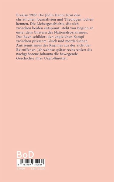 Breslau 1929: Die Jüdin Hanni lernt den christlichen Journalisten und Theologen Jochen kennen. Die Liebesgeschichte, die sich zwischen beiden entspinnt, steht von Beginn an unter dem Unstern des Nationalsozialismus. Das Buch schildert den ungleichen Kampf zwischen privatem Glück und mörderischen Antisemitismus des Regimes aus der Sicht der Betroffenen. Jahrzehnte später recherchiert die nachgeborene Johanna die bewegende Geschichte ihrer Urgroßmutter.