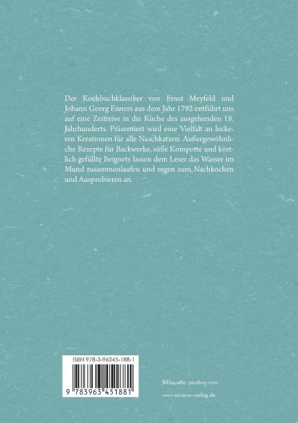 Der Kochbuchklassiker von Ernst Meyfeld und Johann Georg Enners aus dem Jahr 1792 entführt uns auf eine Zeitreise in die Küche des ausgehenden 18. Jahrhunderts. Präsentiert wird eine Vielfalt an leckeren Kreationen für alle Naschkatzen. Außergewöhnliche Rezepte für Backwerke, süße Kompotte und köstlich gefüllte Beignets lassen dem Leser das Wasser im Mund zusammenlaufen und regen zum Nachkochen und Ausprobieren an.