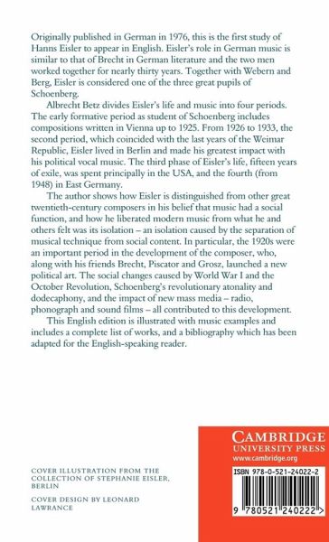 Eisler's role in German music is similar to that of Brecht in German literature and the two men worked together for nearly thirty years. Together with Webern and Berg, Eisler is considered one of the three great pupils of Schoenberg. Albrecht Betz divides Eisler's life and music into four periods. The early formative period as student of Schoenberg includes compositions written in Vienna up to 1925. From 1926 to 1933, the second period, Eisler lived in Berlin and made his greatest impact with his political vocal music. The third phase of Eisler's life, fifteen years of exile, was spent principally in the USA, and the fourth (from 1948) in East Germany. The author shows how Eisler is distinguished from other great twentieth-century composers in his belief that music had a social function, and how he liberated modern music from what he and others felt was its isolation. Originally published in German in 1976, this English edition is illustrated with music examples and includes a complete list of works, and a bibliography which has been adapted for the English-speaking reader.
