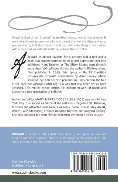 Gretel looked at her [mother] in troubled silence, wondering whether it were very wicked to care more for one parent than for the other-and sure, yes, quite sure, that she dreaded her father, while she clung to her mother with a love that was almost idolatry. -from Hans Brinker A beloved childhood favorite for a century and a half-and a book that readers continue to enjoy and appreciate long into adulthood-Hans Brinker, or The Silver Skates went through more than 100 editions during the author's lifetime alone. First published in 1865, this replica of the 1917 edition features the exquisite illustrations by Alice Carsey, whose sensitive eye and delicate pen-and-ink lines enliven the tale of the poor but virtuous Dutch boy in a way that few other artists have achieved. This replica edition brings the enchanting work of Dodge and Carsey to a new generation of children. Author and editor Mary Mapes Dodge (1831-1905) was born in New York City. She served as editor of the children's magazine St. Nicholas, to which she attracted such writers as Mark Twain, Louisa May Alcott, Robert Louis Stevenson, Frances Hodgson Burnett, and Rudyard Kipling. She also authored the short-fiction collection Irvington Stories (1864).