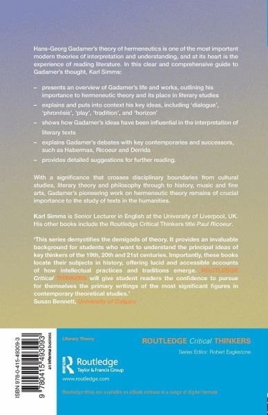 Hans-Georg Gadamer's theory of hermeneutics is one of the most important modern theories of interpretation and understanding, and at its heart is the experience of reading literature. In this clear and comprehensive guide to Gadamer's thought, Karl Simms: