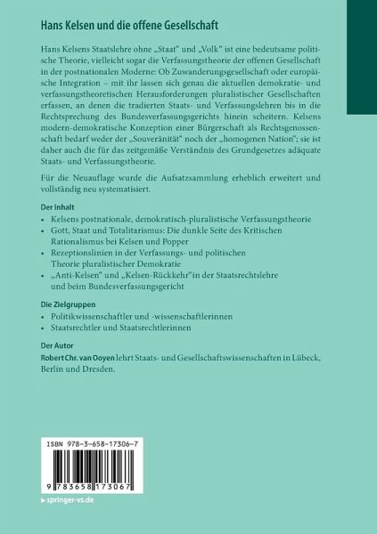 Einführung: Hans Kelsen und die Verfassungstheorie der offenen Gesellschaft.- Staat und pluralistische Gesellschaft bei Kelsen.- Der Streit um die Staatsgerichtsbarkeit in Weimar aus demokratietheoretischer Sicht: Triepel - Kelsen - Schmitt - Leibholz.- Exkurs: Relativismus, Positivismus und Demokratie bei Radbruch und Thoma.- Staatstheologie - politische Theologie - politische Religionen: Von Kelsen über Schmitt zu Voegelin.- Rückfall in die Barbarei? Leistungen und Grenzen der "Offenen Gesellschaft" von Popper als Werk der Totalitarismustheorie.- Verfassungspolitologie des demokratischen "Verfassungsrealismus": Von Lassalle über Kelsen zu Loewenstein.- Neo-Pluralismus als "Anti-Anti-Pluralismus": Die Bedeutung von Kelsen und Schmitt für die politische Theorie von Fraenkel.- Die dunkle Seite des Rechtsstaats: Kirchheimers "Politische Justiz" zwischen Freund-Feind (Schmitt), Klassenjustiz (Fraenkel) und Zvilisierung (Kelsen).- Häberle, die Wiener-Weimarer Staatsklassik und die offene Gesellschaft der europäischen Verfassungs-Kultur.- Demokratische Partizipation statt "Integration": Normativ-staatstheoretische Begründung eines generellen Ausländerwahlrechts nach Kelsen.- Viel Smend (und auch Schmitt), wenig Kelsen: Zur Rezeption in der deutschen Staatsrechtslehre.- Homogenes Staatsvolk statt EU-Bürgerschaft: Das BVerfG zitiert Heller, meint Schmitt und verwirft Kelsens postnationales Konzept demokratischer Rechtsgenossenschaft.- Kein Ausländerwahlrecht: Der Staatsgerichtshof Bremen entscheidet gegen Kelsens demokratische Avantgarde - oder: Was ist ein (europäisches) Volk?.- Die "Kopftuch-Entscheidung" des Bundesverfassungsgerichts zwischen Pluralismustheorie (Kelsen / Fraenkel) und Staatstheologie (Hegel/Schmitt).- Die andere Demokratietheorie des BVerfG: Popper / Häberle und eine (unbewusste) Kelsen-Rezeption im Brokdorf-Beschluss (1985) als Alternative zum Legitimationskettenmodell von Schmitt / Böckenförde.- Weimar - ein Paradigmenwechsel.- Die "Rückkehr" Kelsens: Zur deutschsprachigen Forschung (2005-2015).