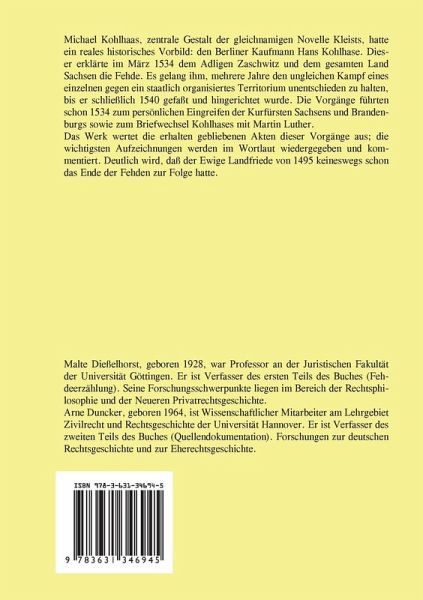Michael Kohlhaas, zentrale Gestalt der gleichnamigen Novelle Kleists, hatte ein reales historisches Vorbild: den Berliner Kaufmann Hans Kohlhase. Dieser erklärte im März 1534 dem Adligen Zaschwitz und dem gesamten Land Sachsen die Fehde. Es gelang ihm, mehrere Jahre den ungleichen Kampf eines einzelnen gegen ein staatlich organisiertes Territorium unentschieden zu halten, bis er schließlich 1540 gefaßt und hingerichtet wurde. Die Vorgänge führten schon 1534 zum persönlichen Eingreifen der Kurfürsten Sachsens und Brandenburgs sowie zum Briefwechsel Kohlhases mit Martin Luther. Das Werk wertet die erhalten gebliebenen Akten dieser Vorgänge aus; die wichtigsten Aufzeichnungen werden im Wortlaut wiedergegeben und kommentiert. Deutlich wird, daß der Ewige Landfriede von 1495 keineswegs schon das Ende der Fehden zur Folge hatte.