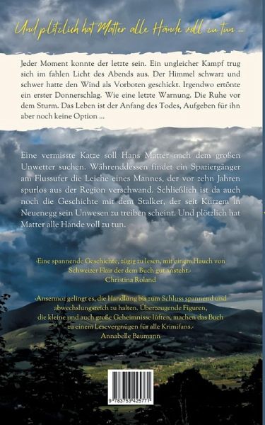 Jeder Moment konnte der letzte sein. Ein ungleicher Kampf trug sich im fahlen Licht des Abends aus. Der Himmel schwarz und schwer hatte den Wind als Vorboten geschickt. Irgendwo ertönte ein erster Donnerschlag. Wie eine letzte Warnung. Die Ruhe vor dem Sturm. Das Leben ist der Anfang des Todes, Aufgeben für ihn aber noch keine Option ... Eine vermisste Katze soll Hans Matter nach dem grossen Unwetter suchen. Währenddessen findet ein Spaziergänger am Flussufer die Leiche eines Mannes, der vor zehn Jahren spurlos aus der Region verschwand. Schliesslich ist da auch noch die Geschichte mit dem Stalker, der seit Kurzem in Neuenegg sein Unwesen zu treiben scheint. Und plötzlich hat Matter alle Hände voll zu tun.