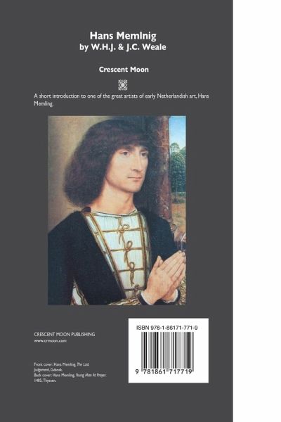 HANS MEMLING By W. H. J. & J. C. Weale A fully illustrated introduction to one of the masters of Early Netherlandish painting, Hans Memling (1433-1494). Early Netherlandish painting, also known as Flemish painting, is characterized by figurative realism, its incredible sense of domestic interiors and details, luminous light, its 'realist' faces, and its fusions of a micro- and macro- cosmic vision. All Early Netherlandish paintings were made on wood panels, and painted from light to dark in thin glazes. It is partly this subtle glazing which gives Early Netherlandish painting its glorious luminescence. The Early Netherlandish artists exploited the effects of different hues and thicknesses of glazes of oil paint, controlling how the glazes reflected light. Fully illustrated in a brand new format, including contemporaries of Hans Memling. Bibliography and notes. Painters Series. 108 pages. www.crmoon.com