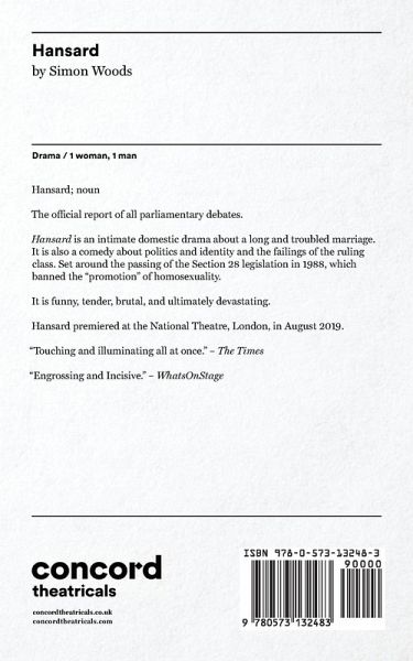 Hansard; noun The official report of all parliamentary debates. Hansard is an intimate domestic drama about a long and troubled marriage. It is also a comedy about politics and identity and the failings of the ruling class. Set around the passing of the Section 28 legislation in 1988, which banned the "promotion" of homosexuality. It is funny, tender, brutal, and ultimately devastating. Hansard premiered at the National Theatre, London, in August 2019.