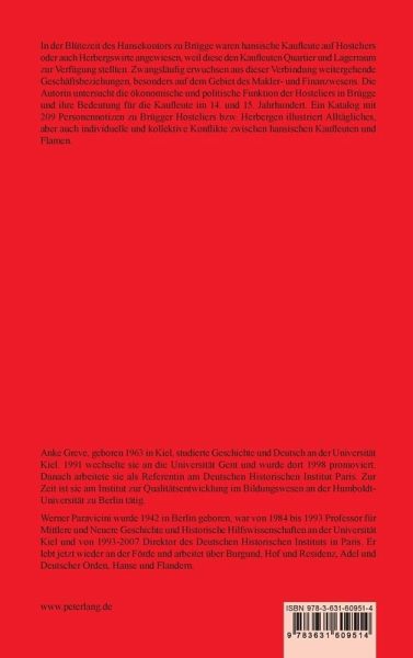 In der Blütezeit des Hansekontors zu Brügge waren hansische Kaufleute auf Hosteliers oder auch Herbergswirte angewiesen, weil diese den Kaufleuten Quartier und Lagerraum zur Verfügung stellten. Zwangsläufig erwuchsen aus dieser Verbindung weitergehende Geschäftsbeziehungen, besonders auf dem Gebiet des Makler- und Finanzwesens. Die Autorin untersucht die ökonomische und politische Funktion der Hosteliers in Brügge und ihre Bedeutung für die Kaufleute im 14. und 15. Jahrhundert. Ein Katalog mit 209 Personennotizen zu Brügger Hosteliers bzw. Herbergen illustriert Alltägliches, aber auch individuelle und kollektive Konflikte zwischen hansischen Kaufleuten und Flamen.